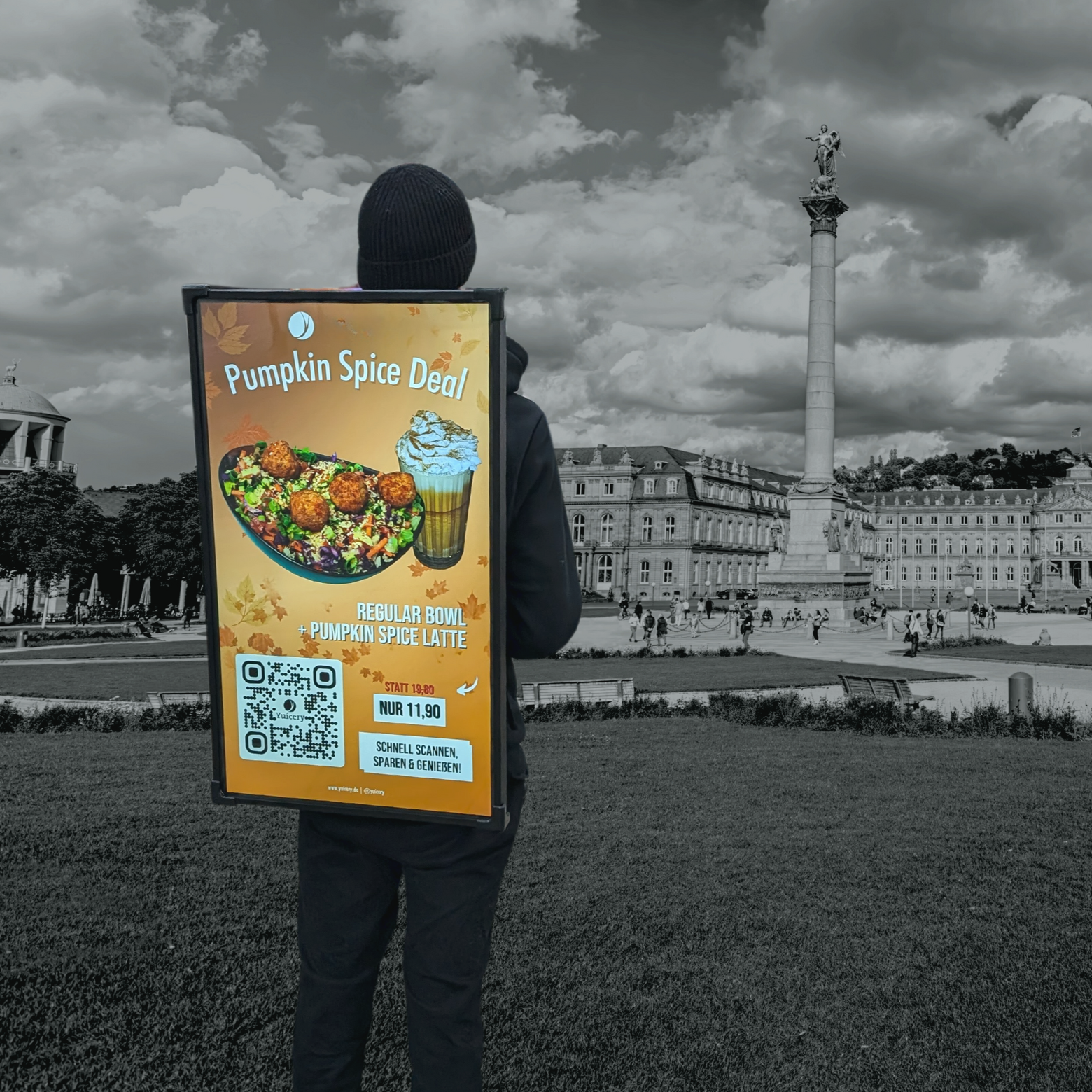 Walking Screen bietet Dir die einzigartige Möglichkeit, Deine lokale Präsenz zu stärken und dadurch Deinen Umsatz zu steigern. Wir bringen Deine Botschaft direkt zu Deinen potenziellen Kunden, wo immer sie sich gerade in der Innenstadt aufhalten.